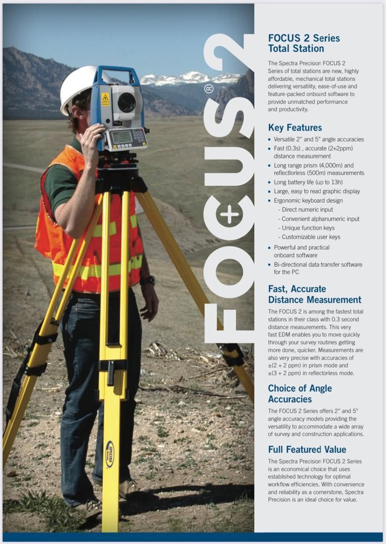 The Spectra Precision Focus 2 Series total station are new, highly affordable, delivering versatility, ease-of-use and features-packed onboard software to provide unmatched performance and productivity.